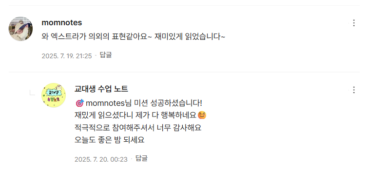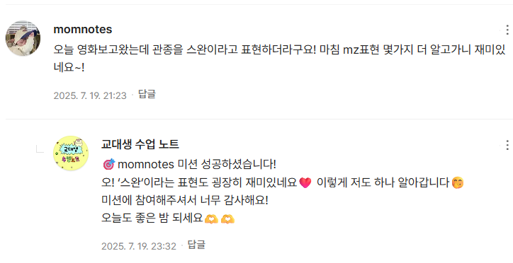 | ✨ [일일 미션 챌린지] 참여형 똑똑해지기 프로젝트 📚 (4) | 2025.07.07 |