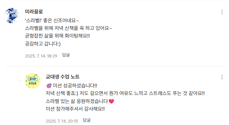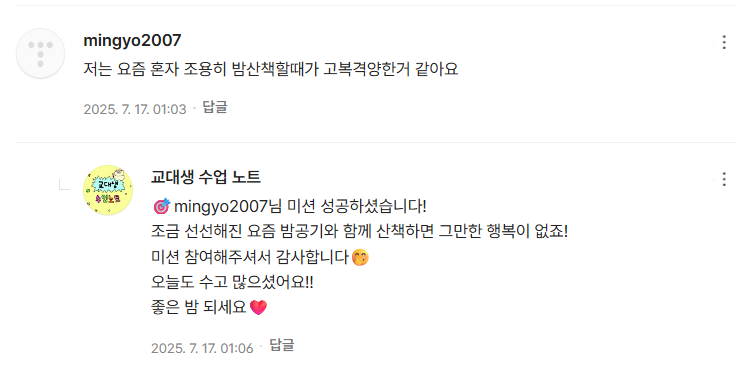 | 🎉 [미션 챌린지 공지] 한 달 함께 달려요! 꾸준함에 상품이 따라옵니다 🎁 (1) | 2025.07.07 |