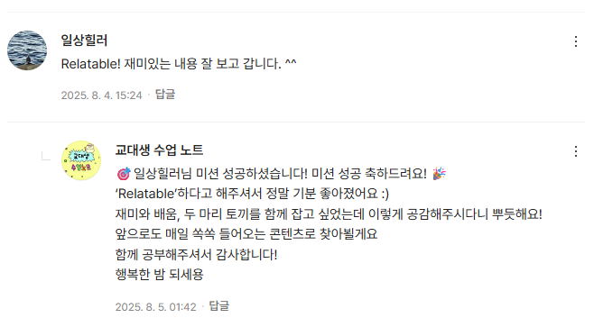 | 🎁[시상식] 똑똑해지기 프로젝트 교수노 챌린저 TOP3 시상식+ 미션 참여 방법 안내 (16) | 2025.08.05 |