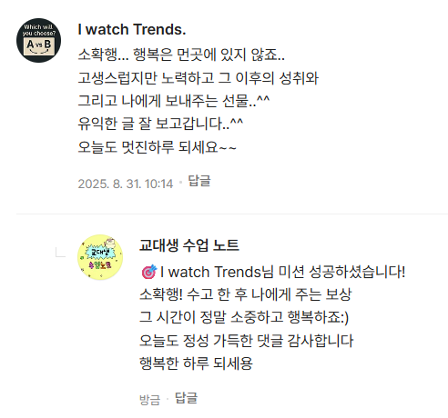 | 🎁[시상식] 똑똑해지기 프로젝트 교수노 챌린저 TOP3 시상식+ 미션 참여 방법 안내 (16) | 2025.08.05 |